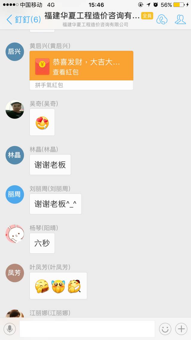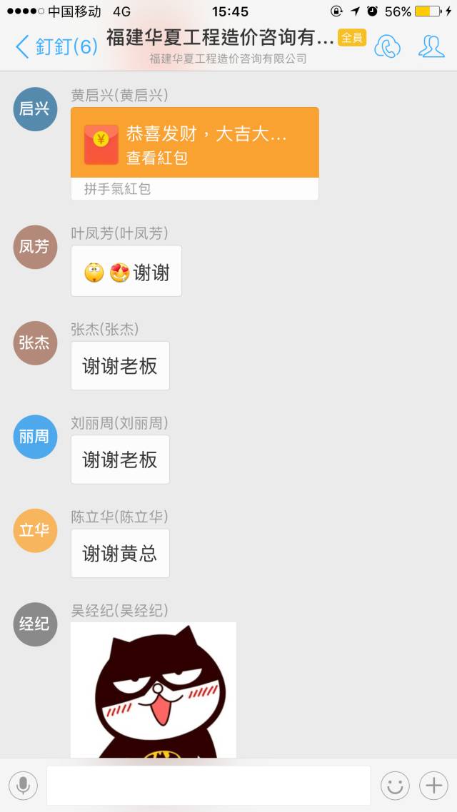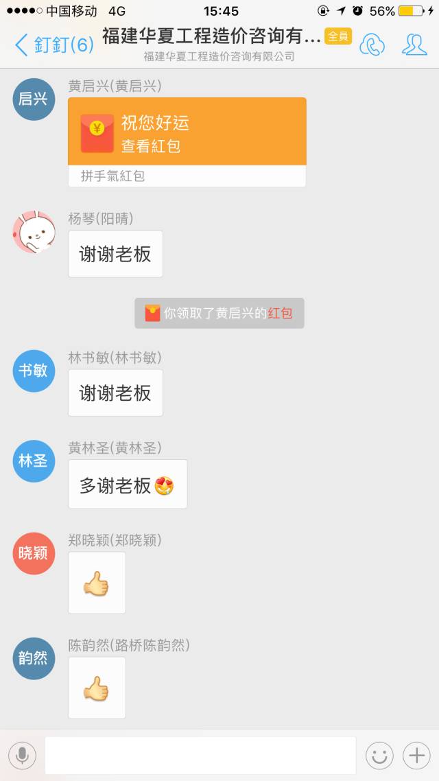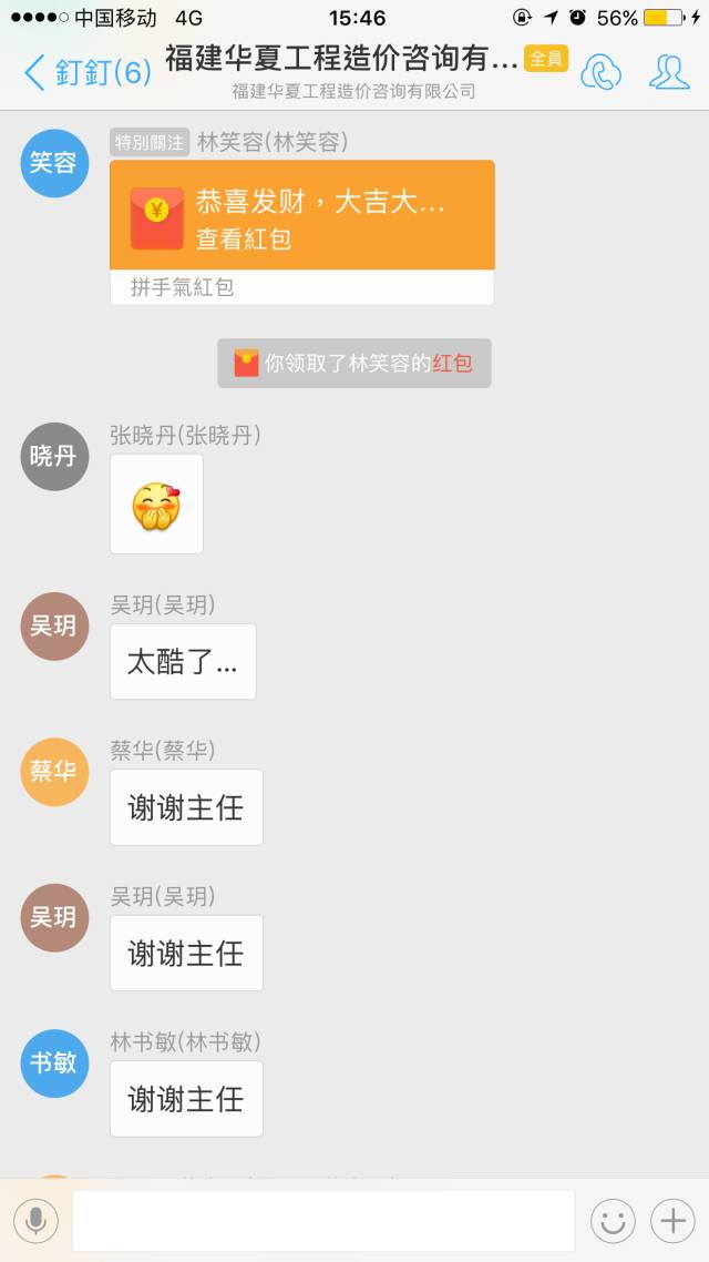 博饼聚餐结束了,然而,福利不止,惊喜不断,意犹未尽,黄总和状元王中王的获得者林主任在公司钉钉群中发红包助兴,祝大家在这中秋、国庆双节快乐~群里再次掀起互动热潮。
