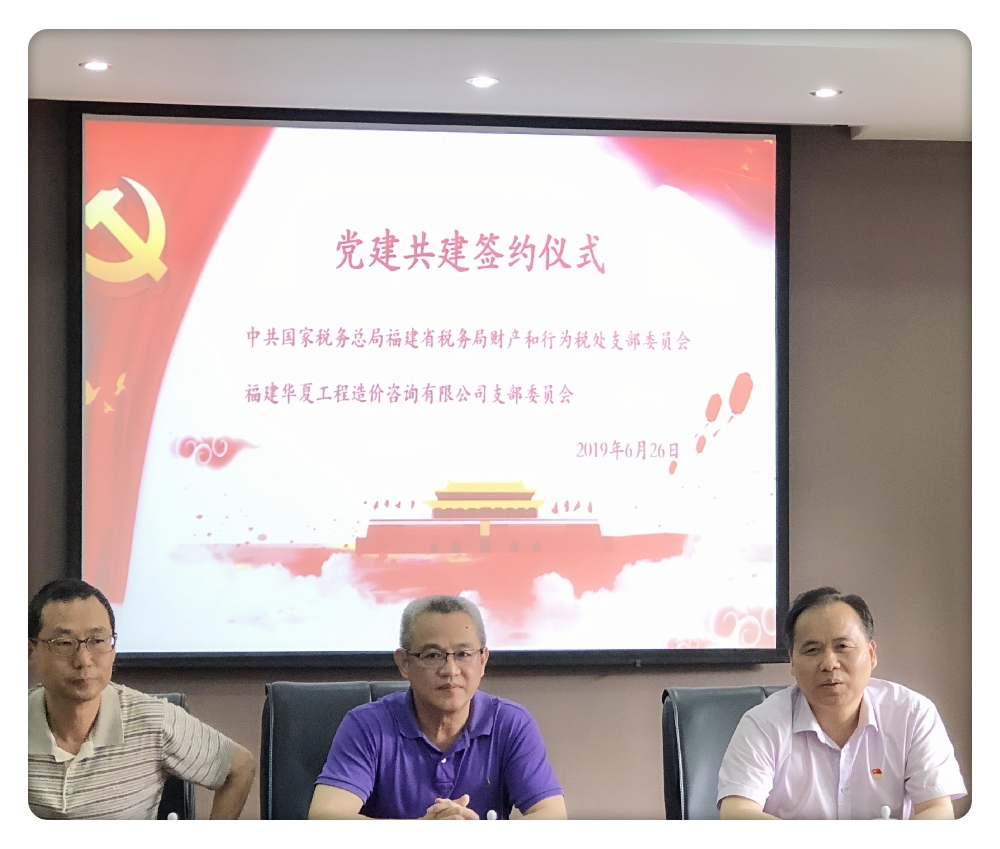 黄启兴董事长说:“华夏公司党支部去年6月成立到现在才刚满一年,党建工作刚刚起步,党建经验欠缺。今天能与福建省税务局财产和行为税处党支部建立党建共建单位,在今后的党建工作中能得到他们的帮助和指导,这对公司来说是一件大好事。我们一定要注重和珍惜这样的好机会,认真的向省税务局财产和行为税处党支部的领导们学习,有效推动公司党建工作和业务工作同步发展。”